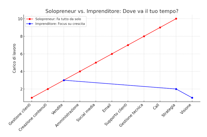 Solopreneur → Mille task, energia dispersa, sempre operativo.